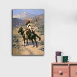In April 1887 Remington journeyed on a sketching expedition to the Canadian West. Traveling to Alberta, he headed north toward Calgary and attempted, with limited success, to sketch the Blackfeet along the Bow River. He collected a large number of artifacts on the trip, and some of them were incorporated into this painting, which he completed in his studio at a later date. The painting was reproduced in Harper’s New Monthly Magazine in May 1891, and the subject was described as “a Cree, or perhaps a Blackfoot, whom one was apt to run across in the Selkirk Mountains or elsewhere on the plains on the British Territory, or well up north in the Rockies.”